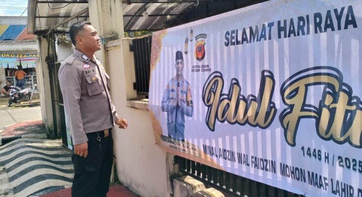 Ciamis – Dalam rangka menyambut Hari Raya Idul Fitri 1446 H/2025, Polsek Rancah, Polres Ciamis, turut memeriahkan suasana Lebaran dengan memasang banner/spanduk ucapan selamat Idul Fitri. Pemasangan dilakukan pada Sabtu, 29 Maret 2025, pukul 09.00 WIB, di depan Kantor Polsek Rancah sebagai bentuk kepedulian dan kebersamaan dengan masyarakat yang merayakan.