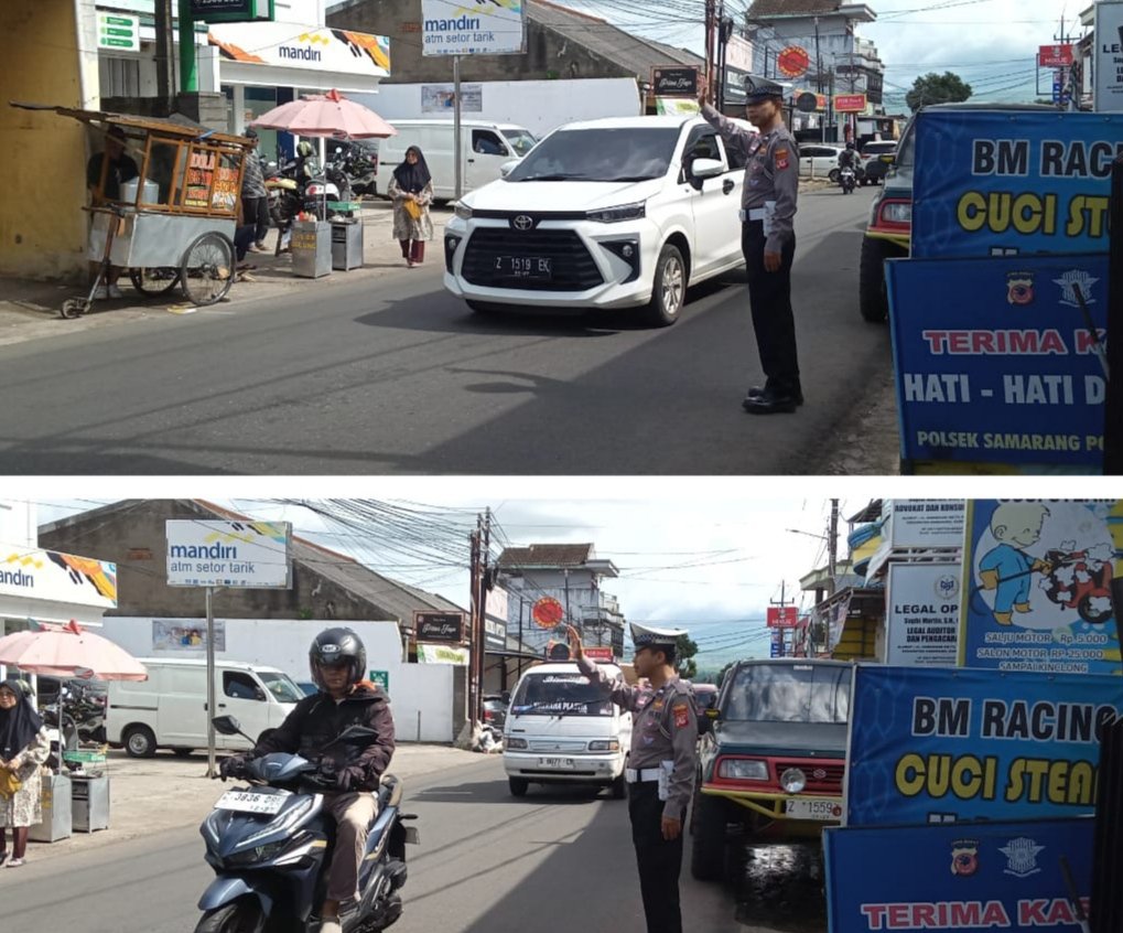 Kapolres Garut, AKBP Mochamad Fajar Gemilang.,S.I.K.M.H.M.IK. melalui Kapolsek Samarang AKP Hilman Nugraha, S.H., menugaskan personelnya, Aipda Ucu Rano dan Bripka Acep Pina S., untuk melaksanakan pengaturan lalu lintas di titik-titik rawan kemacetan. Kegiatan ini mencakup pengaturan arus kendaraan, penyebrangan bagi pejalan kaki, serta penguraian kemacetan yang terjadi di sekitar kawasan tersebut.