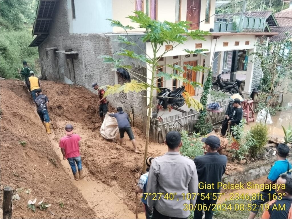 Garut | Polsek Singajaya Polres Garut lakukan pengecekan lokasi tanah longsor di Kp. Cibiru Rt. 04 Rw. 01 Desa Sukamulya Kecamatan Singajaya Kabupaten Garut. (30/6/2023).