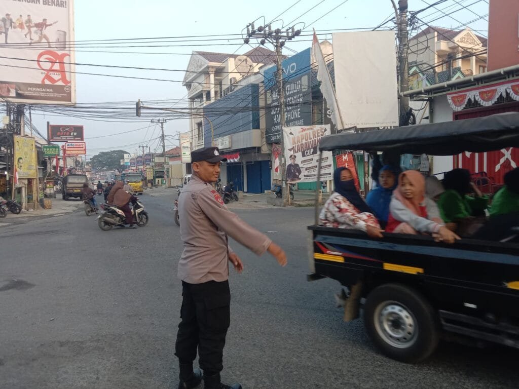 KARAWANG – Aiptu Asep, Personil Polsek Telagasari Polres Karawang Polda Jabar, melakukan giat pengaturan lalulintas di perempatan pasar Telagasari (20/07/2024).