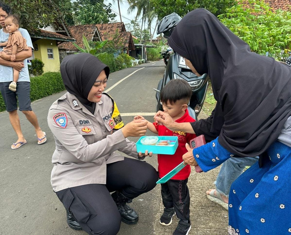 Seperti yang dilakukan oleh jajaran Polsek Ciamis Polres Ciamis Polda Jabar. Tampak terlihat seorang Polwan atau Polisi Wanita hadir langsung ke masyarakat memberikan Makanan Bergizi Tambahan ke Balita Stunting di Desa Mekarjadi, Kecamatan Sadananya, Kabupaten Ciamis, Jawa Barat, Kamis (17/6/2025).