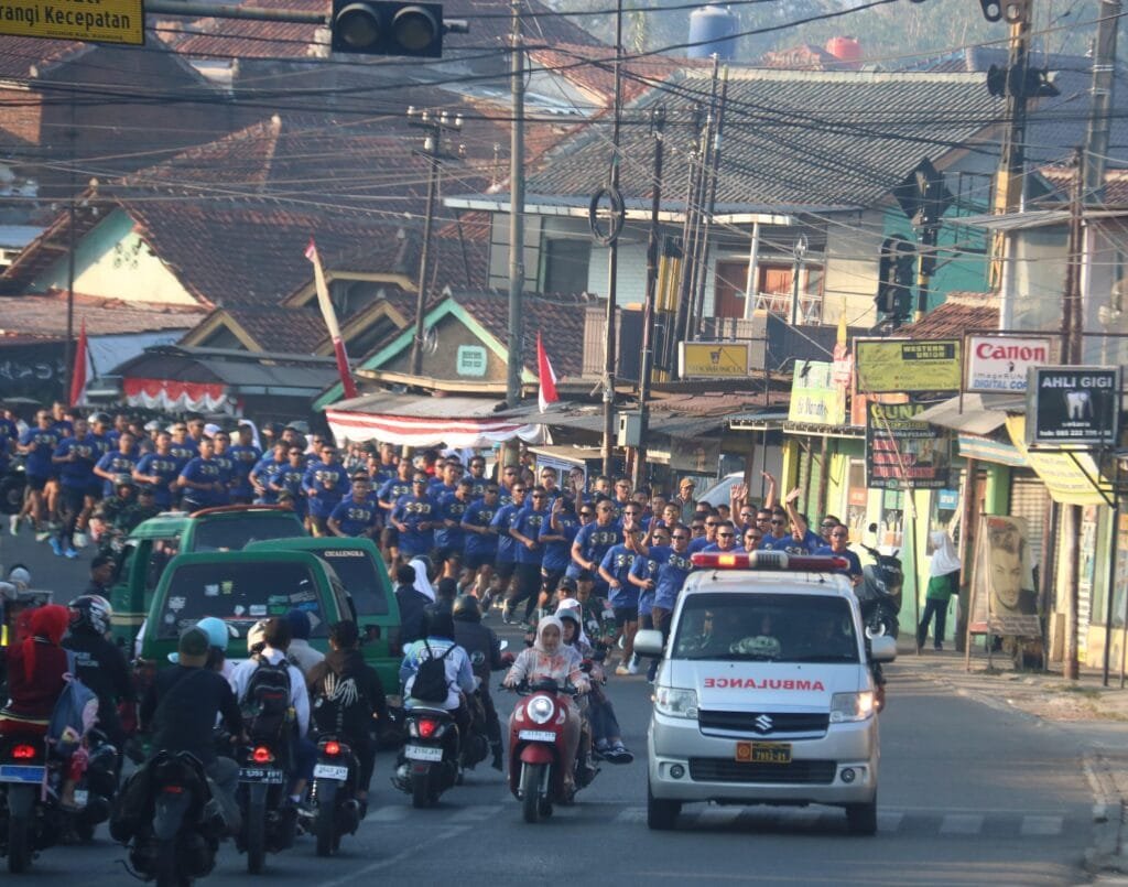 Nagreg – Gemuruh suara para Ksatria Tri Dharma yang sedang berlari dan lantang bernyanyi seakan bersahutan dengan suara tarikan gas kendaraan bermotor yang melintas di sepanjang jalan raya Bandung- Garut saat hangat sinar mentari pagi mulai menyinari bumi Cicalengka, pada Selasa (6/8/24).