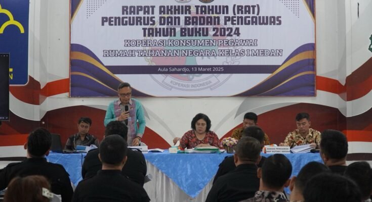 Medan – Koperasi Pegawai Rutan Kelas I Medan menggelar Rapat Anggota Tahunan (RAT) yang berlangsung pada Kamis (13/3) di Aula Sahardjo. Rapat ini dihadiri oleh Kepala Rutan I Medan, Andi Surya, pejabat struktural, seluruh anggota koperasi Rutan medan dan perwakilan dari Dinas Koperasi Kota Medan.