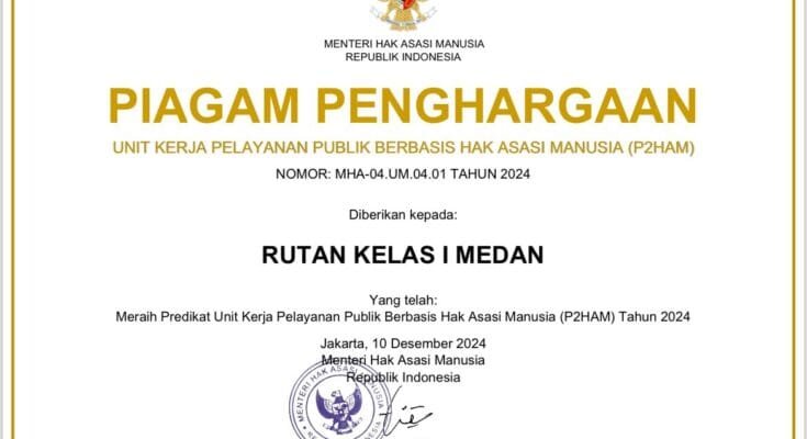 MEDAN , Jejak-kriminal.com – Rumah Tahanan Negara (Rutan) Kelas I Medan berhasil mendapatkan penghargaan berupa Predikat Unit Kerja Berbasis Pelayanan Publik Berbasis HAM (P2HAM) Tahun 2024 dari Menteri Hak Asasi Manusia Natalius Pigai. Rabu (11/12).