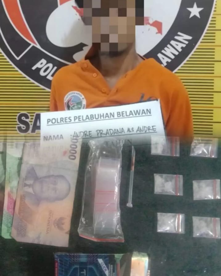 “Tersangka yang diamankan adalah Andre (26), dengan barang bukti berupa 6 plastik klip berisi sabu, 1 plastik klip kosong, 1 pipet ujung runcing, 1 buah kotak rokok, dan uang tunai sebesar Rp 50.000,-.