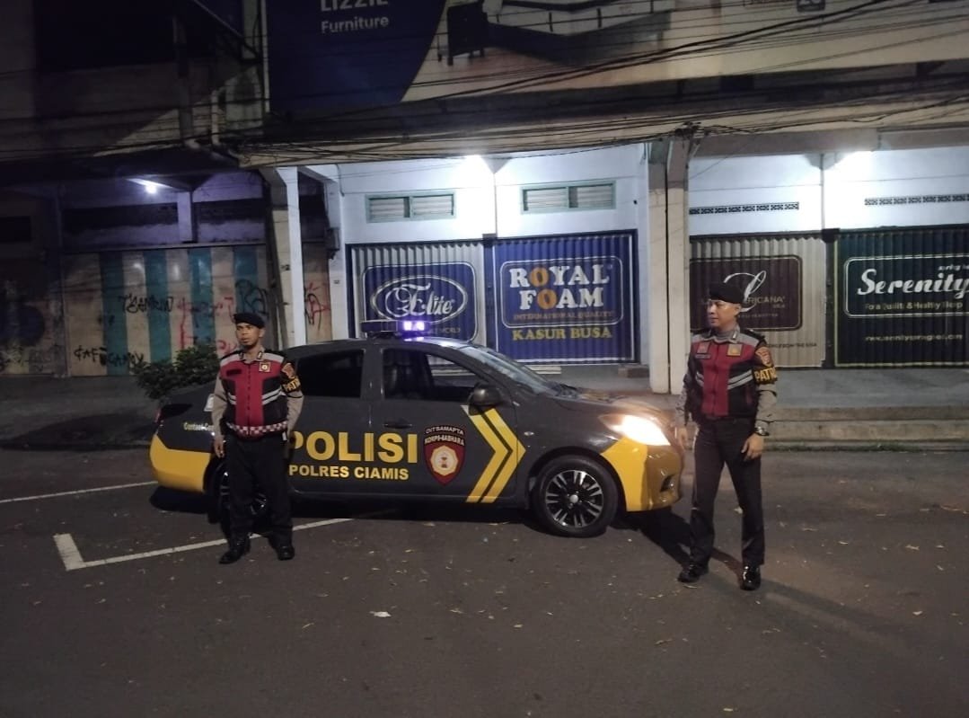 CIAMIS ~ Unit Patroli Sat Samapta Polres Ciamis Polda Jabar melaksanakan Patroli Biru di wilayah rawan tindak kriminalitas dan balapan liar di Kabupaten Ciamis. Patroli ini dilaksanakan di kawasan Ruko Terminal Ciamis, Kabupaten Ciamis, Jawa Barat, Senin, 28 April 2025, malam.