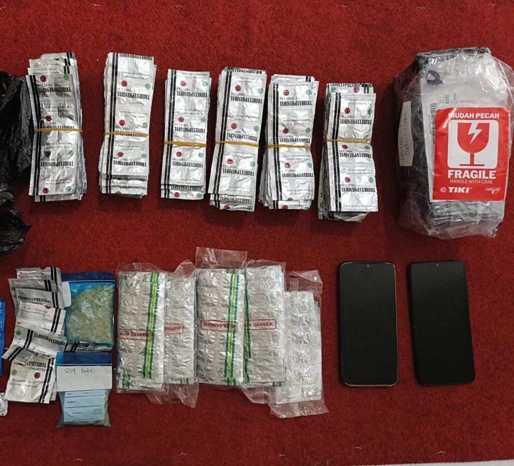 Saat diamankan, dari tangan tersangka petugas menyita barang bukti berupa sebuah kantong kresek warna hitam yang didalamnya terdapat 1.500 butir Tramadol, 1.577 butil Trihexphenidyl, 404 butie Hexymer dan handphone milik korban.