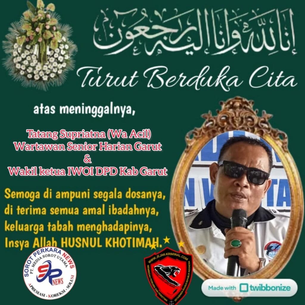 telah berpulang ke rahmatullah, Pak Wakil Ketua DPD IWO indonesia Kabupaten Garut, Alm. Tatang Suprianta ( Wa Achil ) eks wartawan harian Garut News . barusan / Jam 17.35 WIB di rumah kediaman nya di Desa Citeras Malangbong Garut, demikian informasi yang bisa disampaikan, Terima Kasih . pengumuman di Grup aplikasi Percakapan WA diumumkan oleh Ketua DPD IWO Indonesia kab Garut Dede Kamaludi Wahyu .
