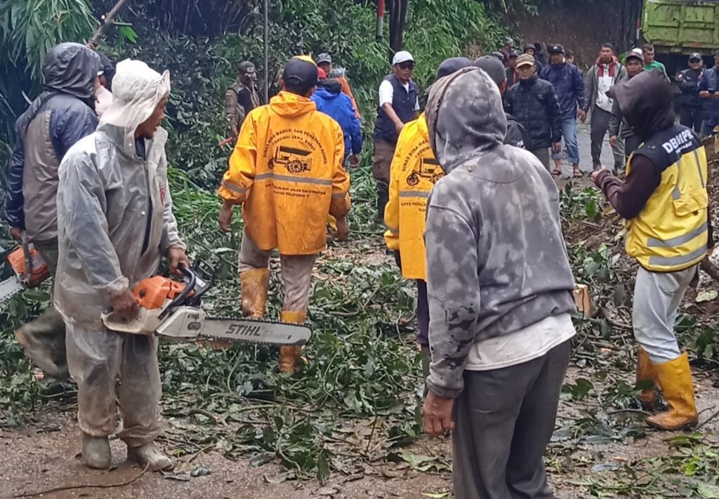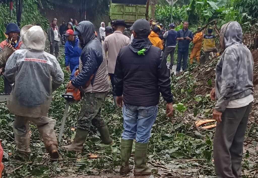 Kepala Desa Pulosari, Agus Rusmana.,S.I.P. menunjukkan aksi cepat tanggap dengan terjun langsung ke lapangan, termasuk membantu membersihkan pohon-pohon tumbang akibat longsor.