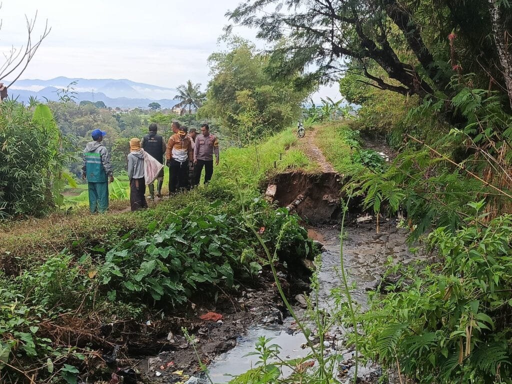 Garut | Polsek Cilawu Polres Garut cek TKP bencana tanah longsor di aliran sungai irigasi Blok Kampung Badama Desa Desakolot Kecamatan Cilawu Kabupaten Garut. Rabu (11/9/2024).