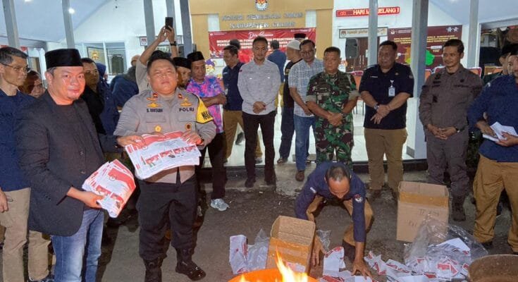 CIAMIS ~ Wakapolres Ciamis Polda Jabar Kompol Muhamad Rustandi, S.I.K., ikut serta memusnahkan surat suara Pilkada Serentak 2024 yang dilaksanakan oleh KPU Kabupaten Ciamis. Pemusnahan ini berlangsung di halaman Kantor KPU Kabupaten Ciamis, Jalan Jenderal Sudirman No.47, Lingkungan Janggala, Kelurahan Ciamis, Kecamatan Ciamis, Kabupaten Ciamis, Jawa Barat, Selasa, 26 November 2024, malam.